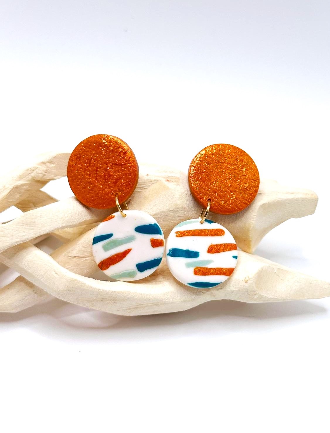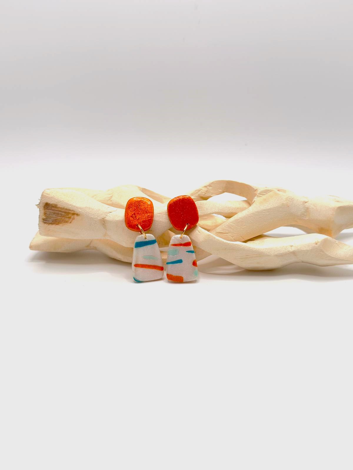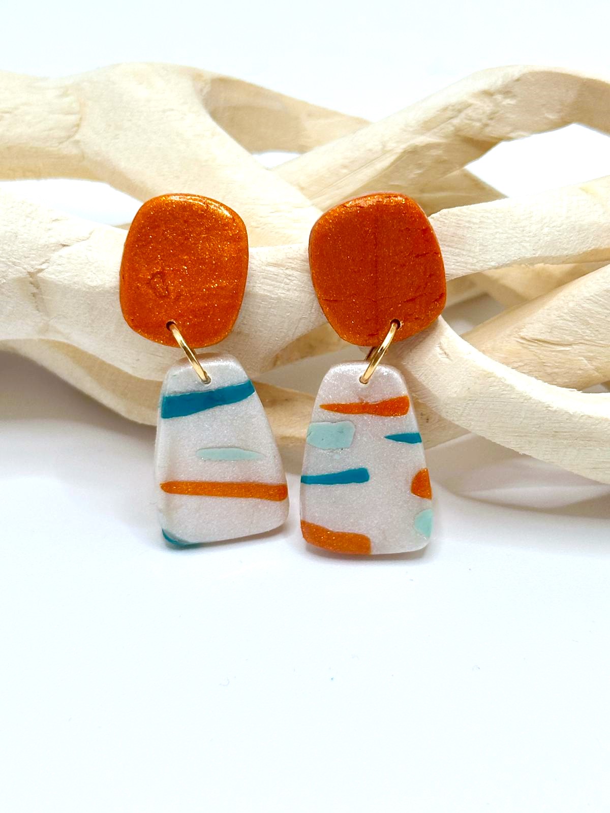 Inspirados na luz quente e nas paisagens da Ilha Dourada, os brincos Areia Pintada combinam o brilho dourado da areia ao sol com um padrão leve e colorido que lembra o movimento do mar. O contraste entre o topo em tom dourado e a base clara com riscas vibrantes cria uma peça moderna, divertida e elegante ao mesmo tempo.