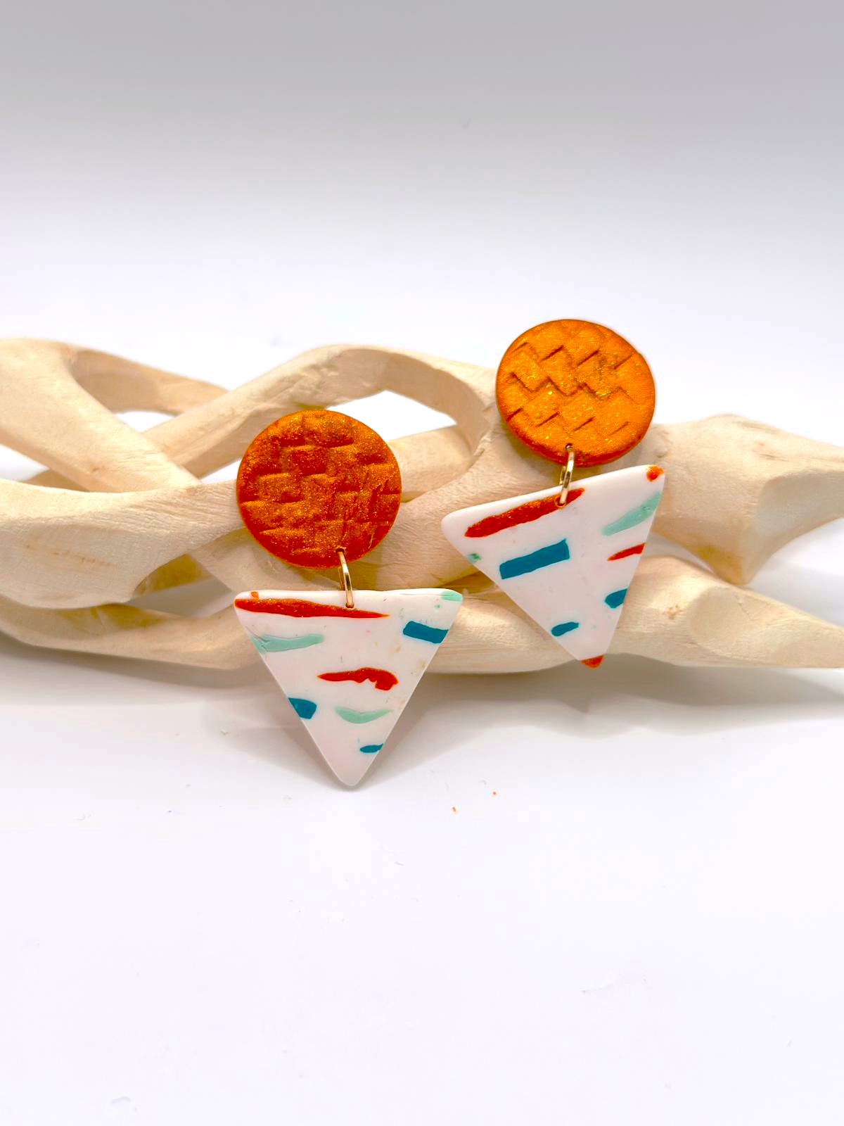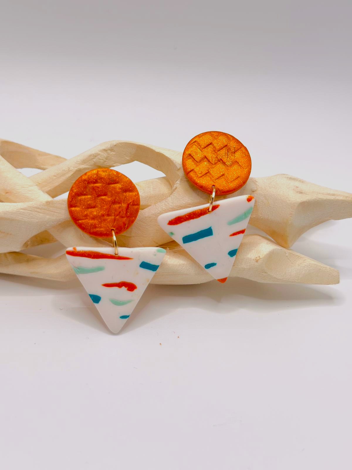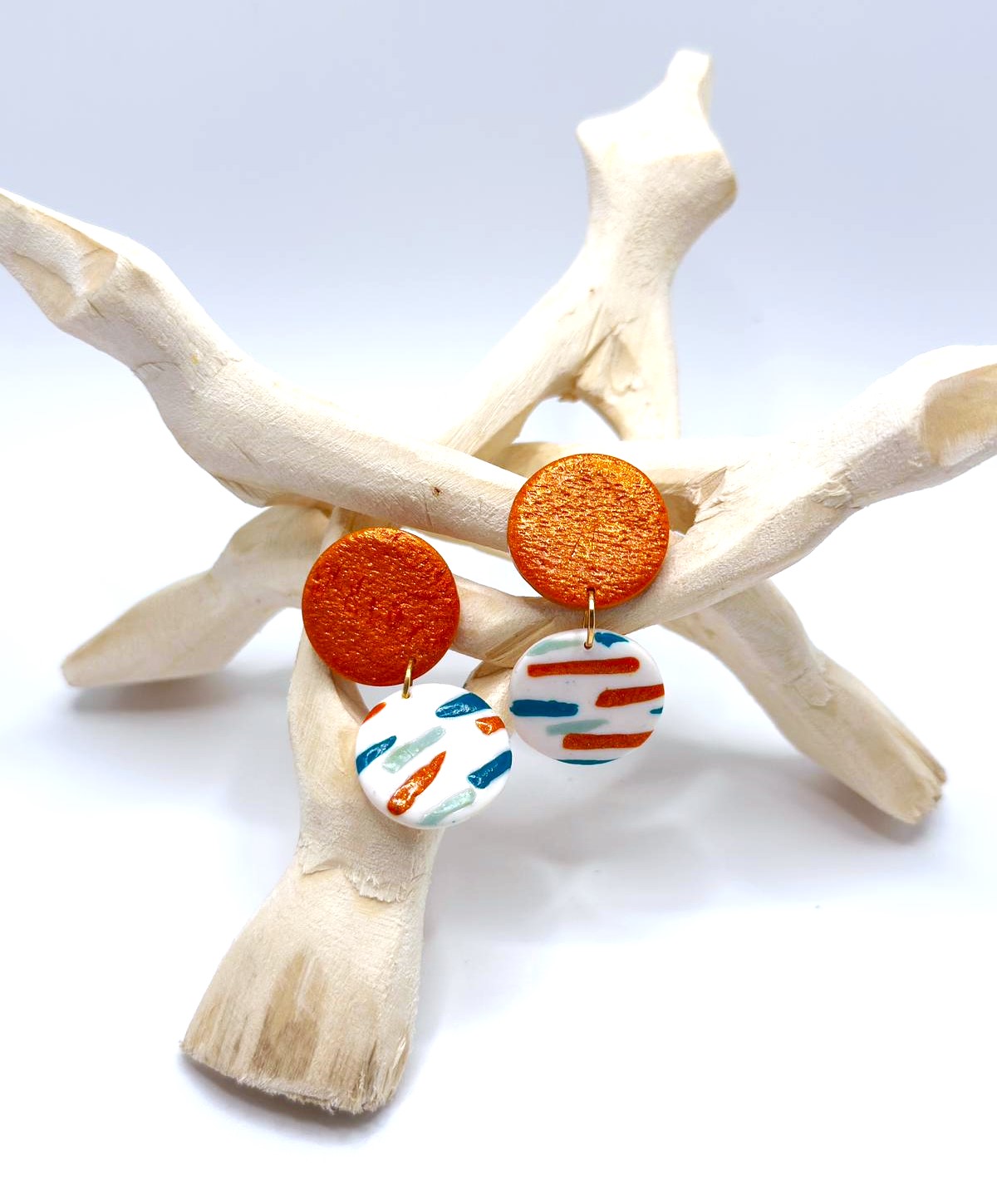 Inspirados na luz quente e nas paisagens da Ilha Dourada, os brincos Areia Pintada combinam o brilho dourado da areia ao sol com um padrão leve e colorido que lembra o movimento do mar. O contraste entre o topo em tom dourado e a base clara com riscas vibrantes cria uma peça moderna, divertida e elegante ao mesmo tempo.