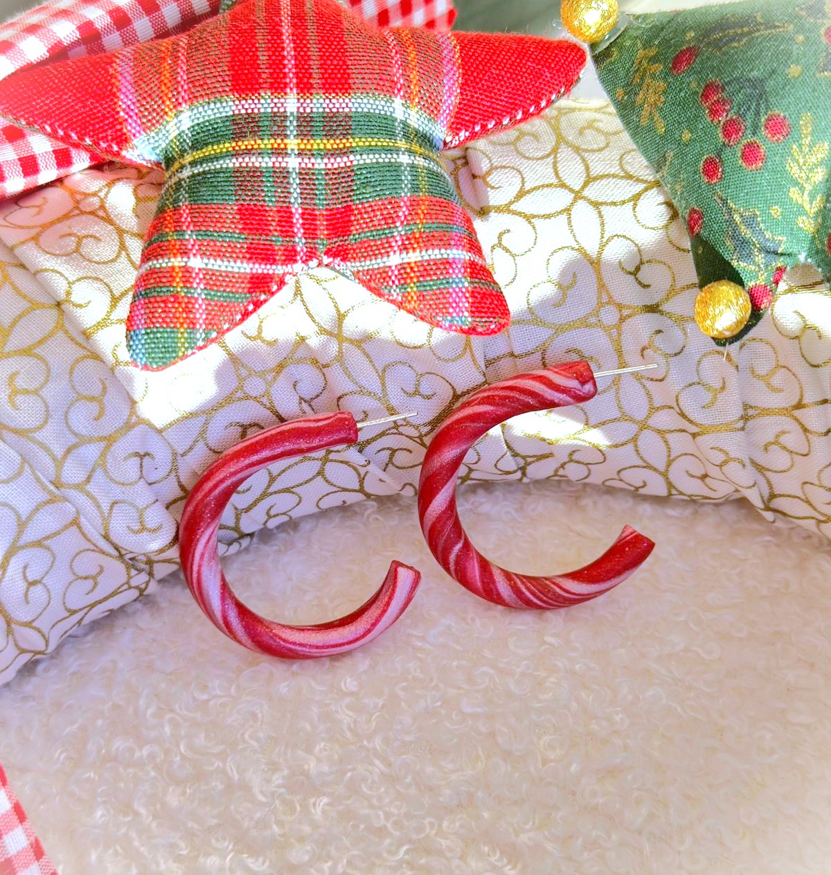 As argolas de ternura são brincos em formato de argola, nas cores vermelho e branco (ambaa as cores com um pouco de brilho).