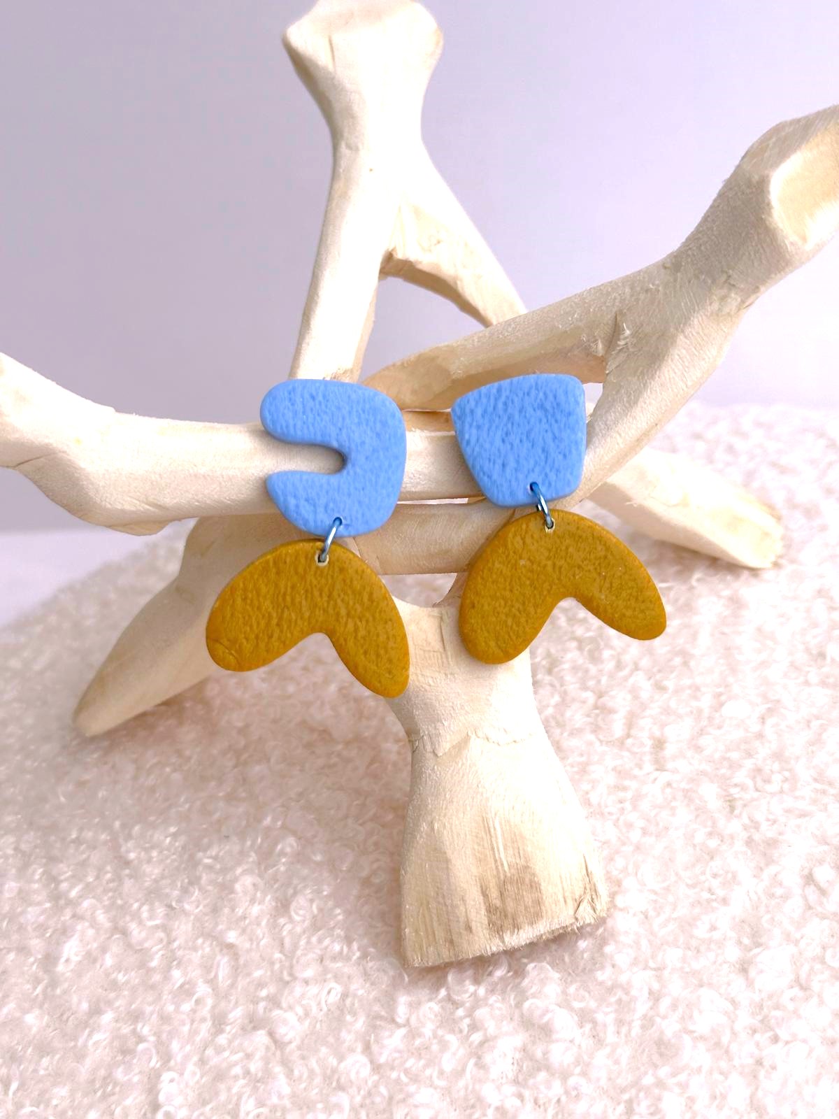 Os Brincos Dunas são compostos por duas peças: uma em azul serenidade e outra em amarelo torrado. A peça principal, em formato de duna, está unida à base (que varia de um brinco para o outro) com uma argola azul clara. Ambas as peças têm textura de areia, criando um acabamento orgânico e elegante.