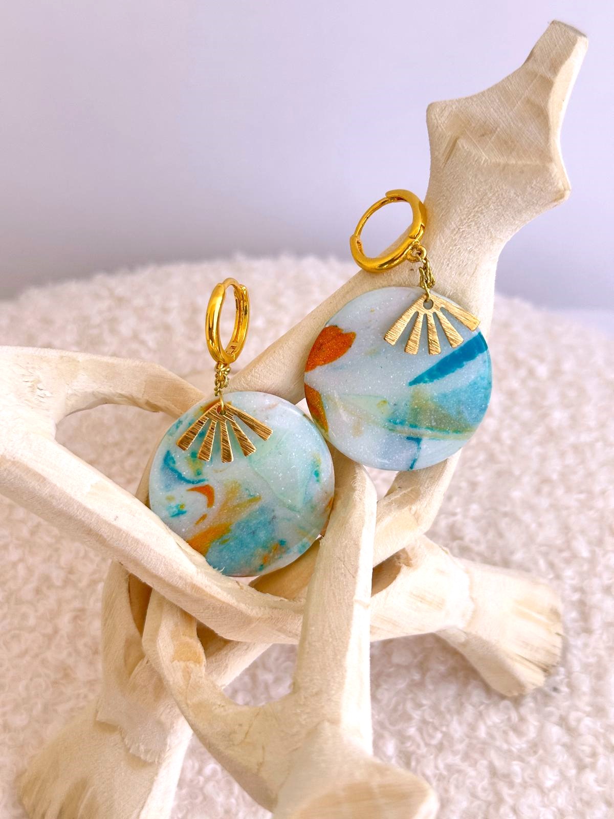 Os Brincos Formosa são compostos por uma peça única de cerâmica com tons de azul, laranja e dourado, finalizada com um pendente metálico em forma de raios de sol, preso por arame dourado. A peça tem acabamento em resina para um brilho sutil e proteção duradoura.