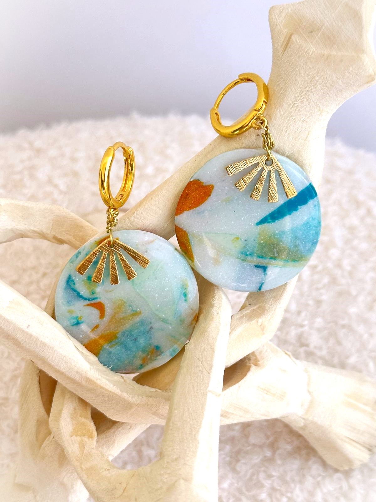 Brincos Formosa, compostos por uma peça única de cerâmica, com com tons de azul, laranja e dourado, e com pendente raios de sol preso com arame dourado. Peça com resina para efeito transparente, brilhante, impermeável e durável.