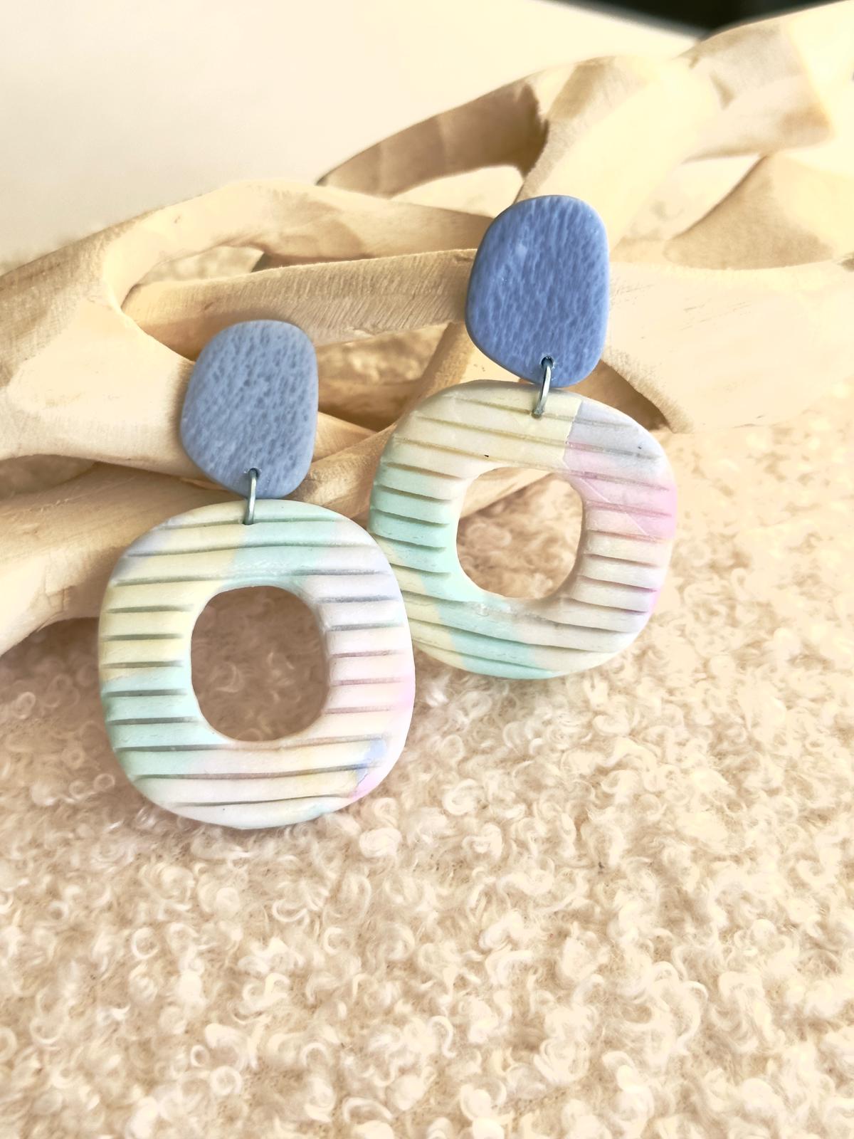 Com uma base azul (em dois tons distintos) e uma peça maior em forma de anel, com textura às riscas e tons aleatórios e suaves, estes brincos são irreverentes e encantadores. As duas partes estão ligadas por uma argola azul prateada, criando um look moderno, leve e único.