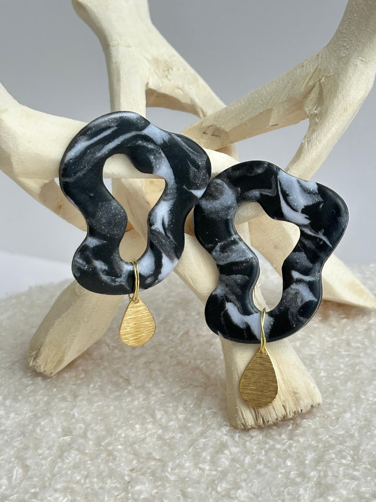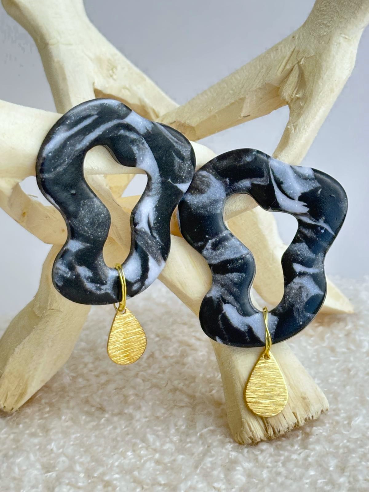 Os Brincos Noite Escura com Gota Dourada têm um formato orgânico, curvo e aleatório. A peça principal em argila de polímero (cerâmica) é envernizada e apresenta um subtil brilho sobre o fundo branco marmorizado. Um pendente metálico em forma de gota dourada, preso com arame também dourado, confere um toque delicado e sofisticado.