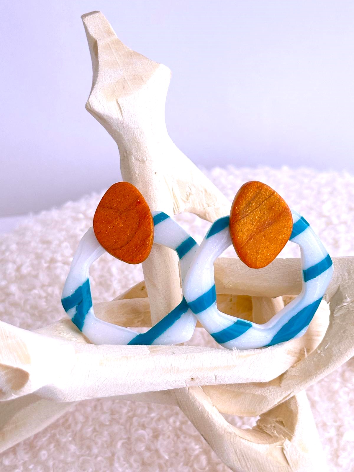 Os brincos Saara combinam formas geométricas e contrastes de cor num design ousado e elegante. Com uma base oval em tom laranja dourado e peça hexagonal em branco e azul, são finalizados com uma camada de resina que lhes dá brilho e durabilidade.