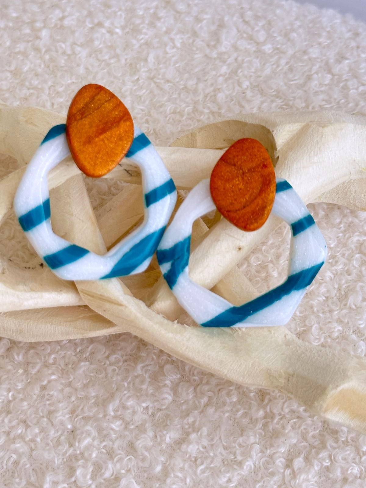 Brincos Saara, com 2 peças unidas. Em formato hexagonal com cores azul e branco e base em tons de laranja dourada.