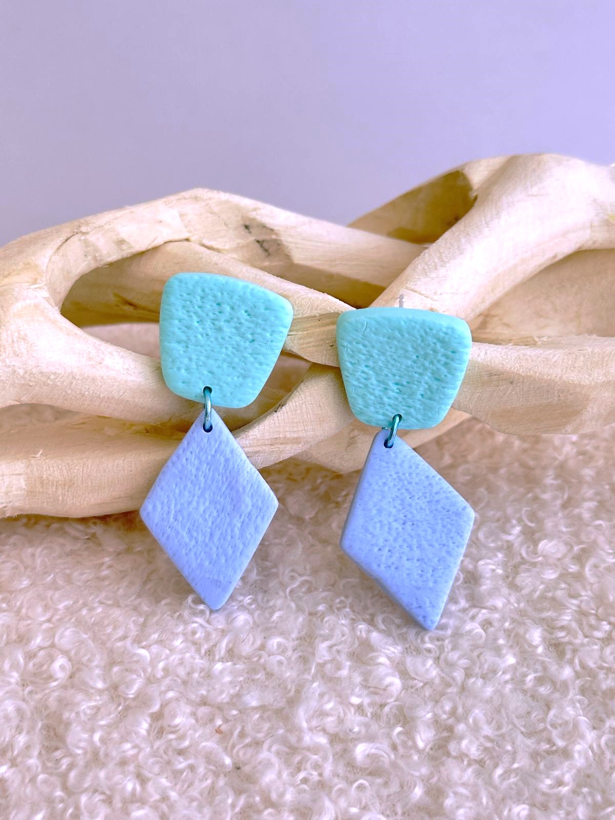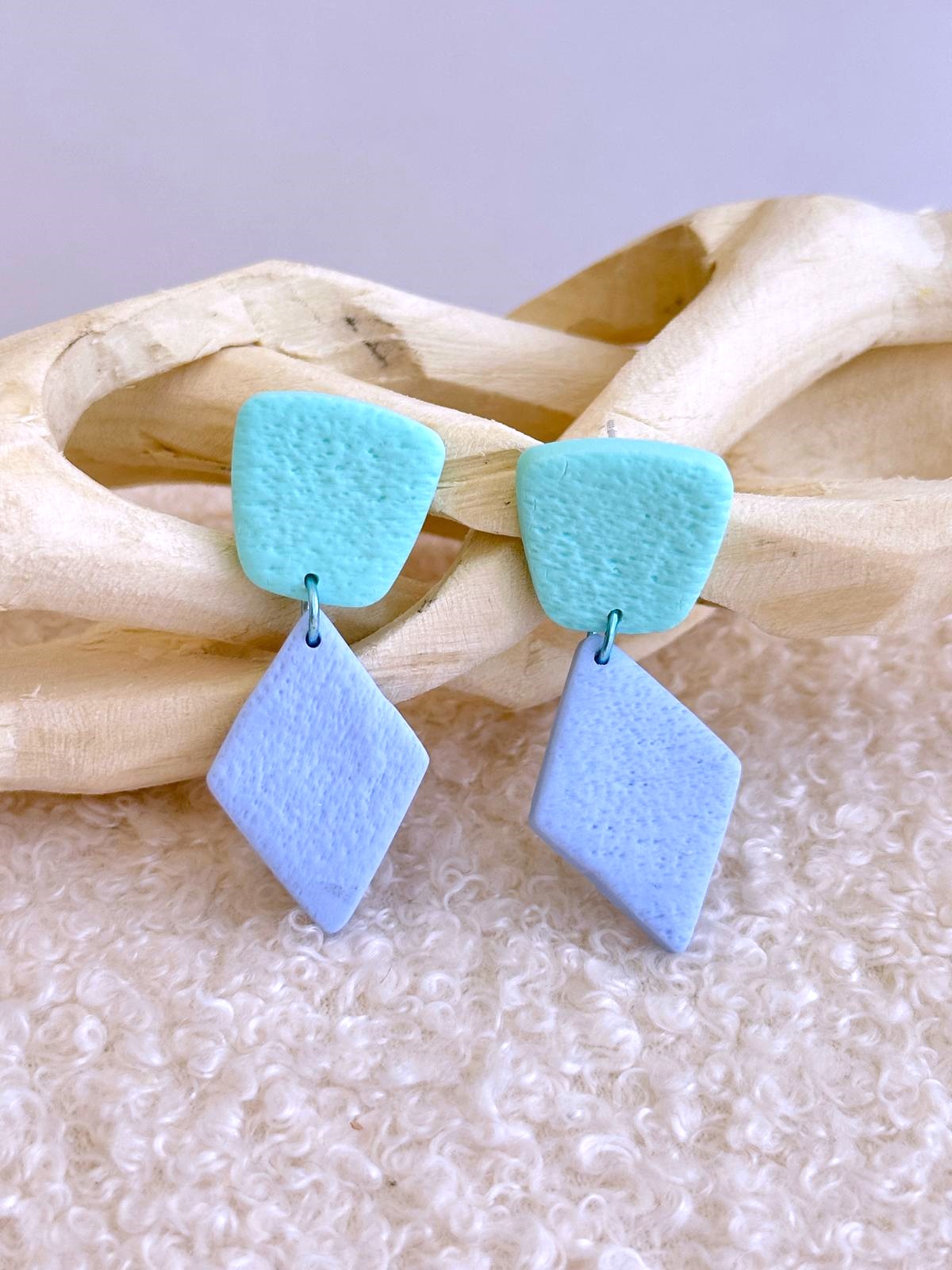 Os brincos Suave | Azul Serenidade combinam a frescura da menta com a tranquilidade do azul, numa peça delicada e cheia de personalidade. Com duas partes — base em tom menta e peça principal em forma de losango azul serenidade — são unidas por uma argola azul e apresentam uma textura de areia suave ao toque.