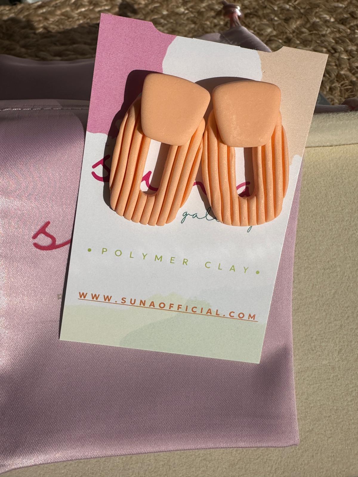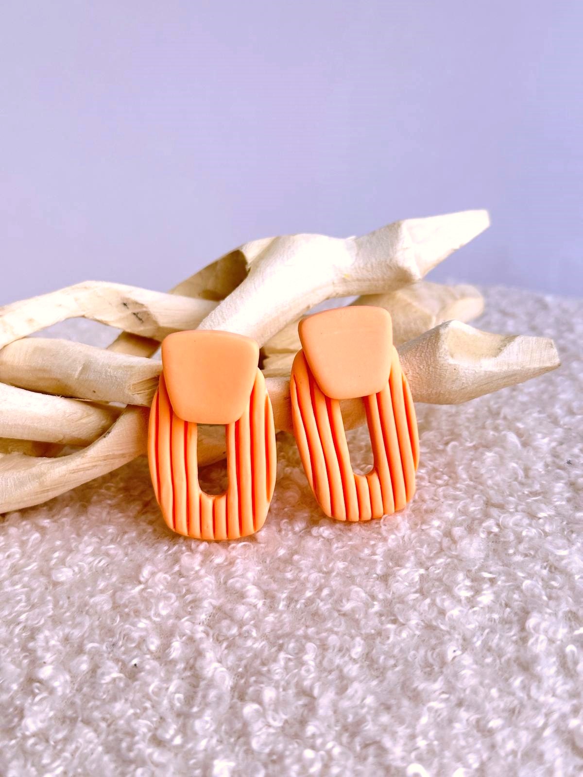 Brincos Suave, em cor salmão / laranja "soft", são uma única peça, em formato retangular com as vértices arredondadas e com textura de areia e riscas. A sua base, da mesma cor, é colada por cima da peça principal.