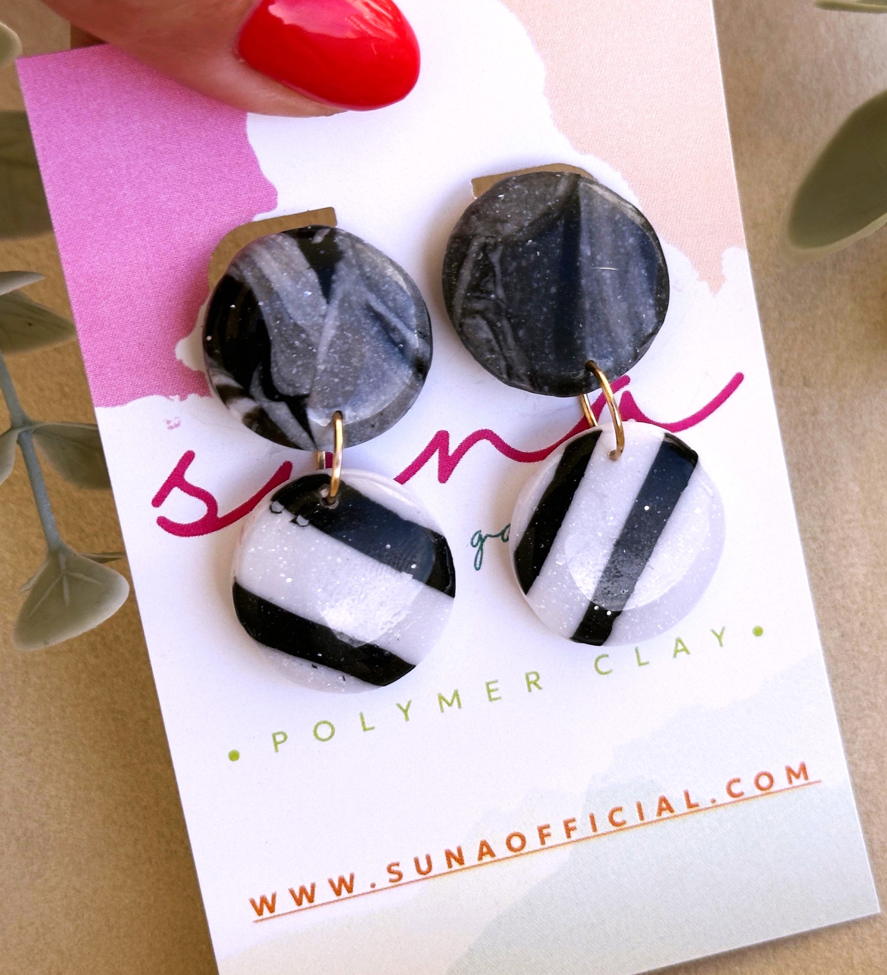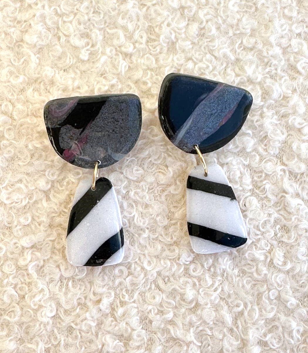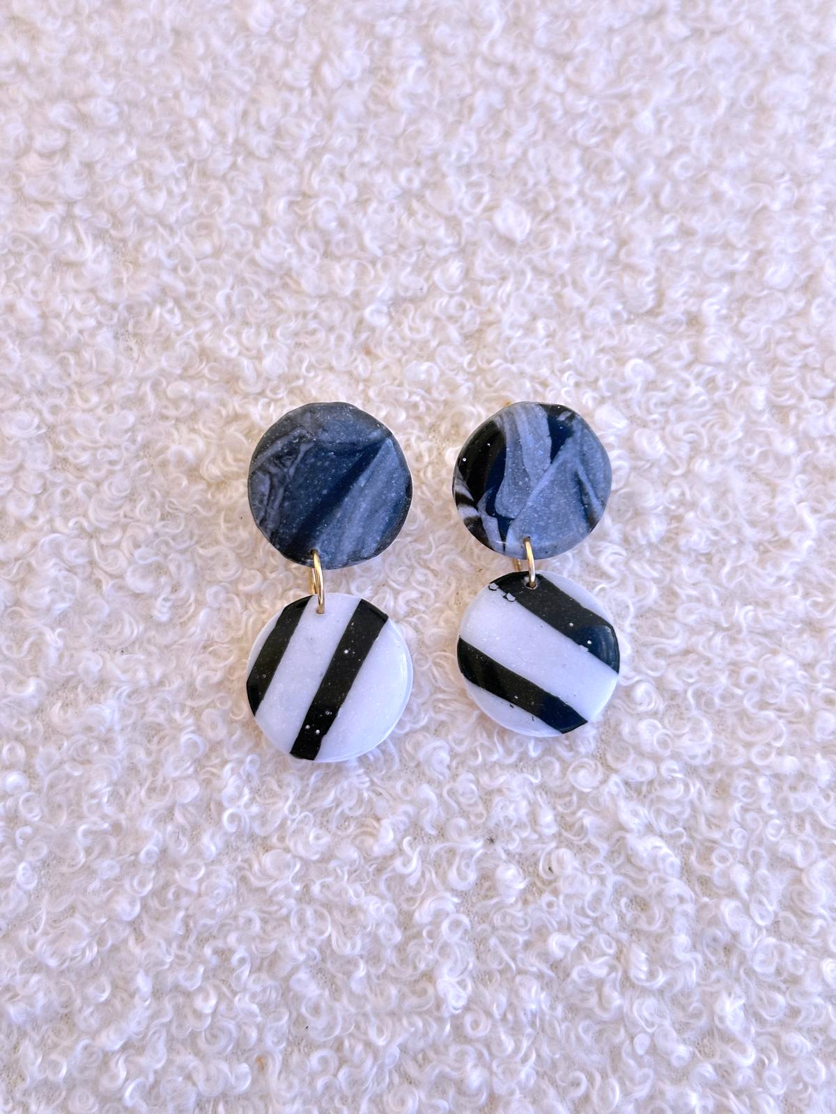 ✨ Zoo Circulares: com duas peças redondas unidas por uma argola dourada, combinam o efeito mármore com base branca e riscas pretas. ✨ Zoo Verticais: meia-lua marmorizada em tons escuros com dois pendentes brancos com riscas pretas, criando movimento e originalidade.